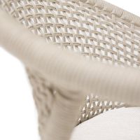 De Jooy tuinstoel kenmerkt zich door zijn zacht vloeiende, ronde vorm. De armleuningen en de comfortabele rug zijn gevlochten met een modern string-flex in de kleur Sand. De stoel is in 2023 ontworpen door Solpuri Design Studio en wordt geleverd inclusief een comfortabel zitkussen in de kleur Bombay Cream.